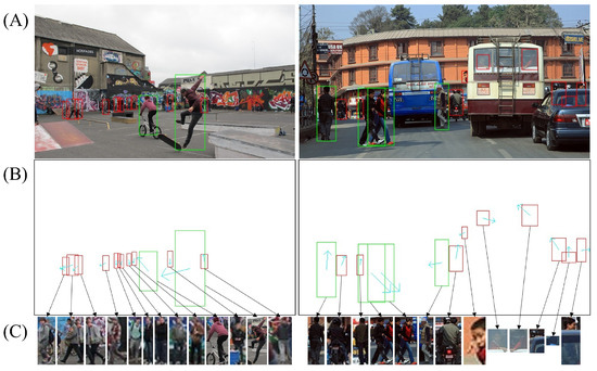 Two examples from the reconstructed MEBOW dataset [25]. (A): original crowd scenes, where green boxes are provided by MEBOW and red boxes are newly added by us. (B): body boxes with orientation arrows (cyan). (C): cropped human instances, including occluded, truncated, or small bodies. These samples are difficult for single-person HBOE methods but are effectively addressed by our single-stage multi-person approach.