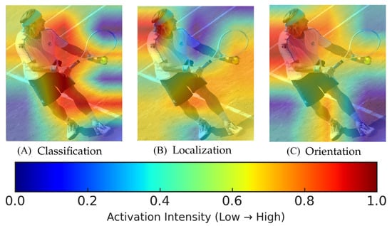 Areas focused on by different tasks. The classification task focuses on the whole body area, the localization task focuses on coordinate positions of the bounding box, and the orientation task focuses on upper half of the body. Warmer colors (red/yellow) indicate higher attention/activation of the corresponding branch, and cooler colors (blue) indicate lower attention.