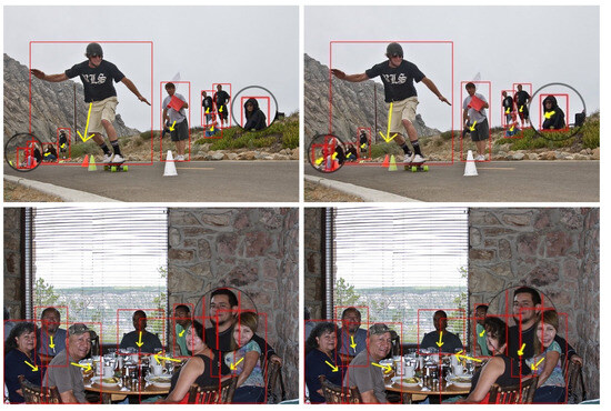 The results on extended MEBOW data. The first column is estimated through MEBOW [25], and the second column is estimated using our method. The red boxes indicate human targets, and the yellow arrows represent body orientation. The yellow arrow is drawn from the bounding box center, where the direction corresponds to the orientational angle. The length of the yellow arrow is fixed relative to the box size for visualization clarity.