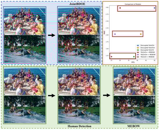 The first row delineates the workflow of our method, while the second row represents MEBOW [25]. The scatter plot in the upper right corner visually compares the FPS and MAE between JointBDOE and MEBOW. The term MAE specifically denotes the difference in the estimation results of JointBDOE and MEBOW when employing an identical detection model. The square frame represents body position, and the arrow indicates its facing direction.