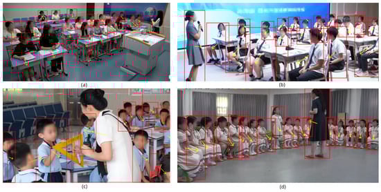 Figure 9 shows the results of student/teacher detection and orientation estimation under various seating arrangements and camera perspectives, where red bounding boxes represent detected teachers and students, and yellow arrows indicate their body orientations. The visualized results demonstrate that the proposed JointBDOE can not only detect almost all the students but also accurately estimate their orientations, even in complex scenarios with crowded students and severe occlusions. From Figure 9, we observe that students’ attention directions are almost consistent with their body orientations; thus, student engagement can be inferred from their body orientations. Meanwhile, JointBDOE can simultaneously identify teachers and their orientations, which supports for mining effective teacher–student interactive patterns.