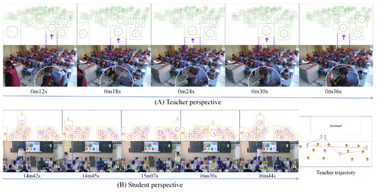 Furthermore, we demonstrate how to use students’ body orientation for engagement analysis based on continuous teaching segments. Figure 10 provides dual-perspective visualizations of body orientations from both the teacher and students, along with simplified diagrams above to enhance readability in crowded scenarios. In case (A), with the teacher perspective of Figure 10, when the teacher turns to write on the blackboard, most students maintain high engagement as their body orientations focus on the teacher/blackboard. Meanwhile, the student pointed by the purple arrow constantly changes his orientation, indicating slight disengagement. Combined with timestamp information (class just begins), this phenomenon may indicate that the student has relatively weak self-discipline and has not yet fully entered a focused learning state during the initial class phase. In case (B), with the student’s perspective of Figure 10, based on the size and position of the bounding box, it can be inferred that the person pointed to with the green arrow is the teacher. Between 14 and 16 min of class, the teacher moved back and forth from the podium to the students’ area. Such a movement pattern indicates that the teacher assigns a task and then walks to the students, checking their progress. During this period, all the students hardly changed their orientation, demonstrating a high level of engagement, while the teacher’s movement path showed attention to each row of students.