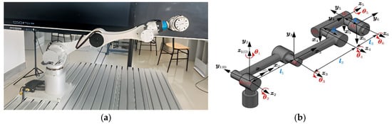 Schematic diagram of the joint coordinate system of DrCbot-6 industrial robot. (a) The physical setup of the industrial robot; (b) Schematic diagram of the joint coordinate system.