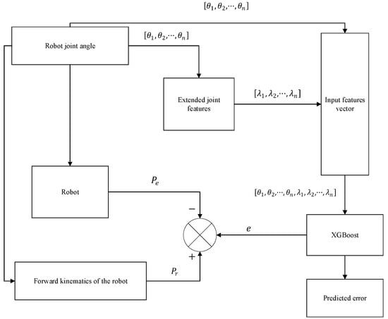 While Equation (9) provides a differential kinematic framework, directly modeling all error sources, especially non-geometric ones like gear backlash, within this framework is exceedingly complex and often leads to intractable non-linear equations. Therefore, instead of pursuing a purely analytical model, this study adopts a data-driven, non-kinematic approach. We use the kinematic relationship established in Equation (10) as a basis to select model inputs. The core idea is to build a machine learning model that directly maps the robot’s state (including factors that influence errors) to the resulting position error.