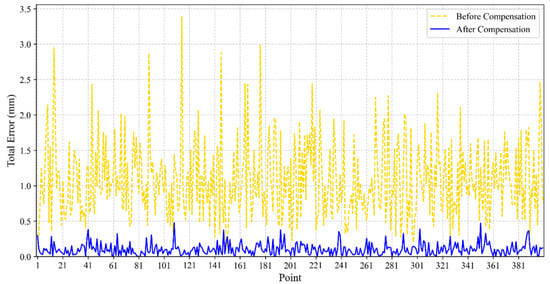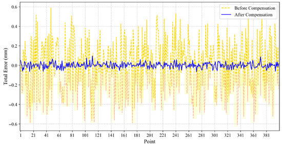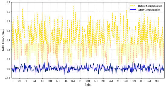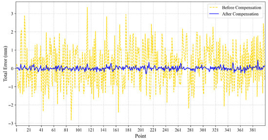 Bai, M. [28] proposed a neural network-based method to improve robot positioning accuracy. First, a genetic particle swarm algorithm was used to optimize a neural network for modeling and predicting the positioning error of an industrial robot. Subsequently, the predicted error was used to compensate for the target points in the robot’s workspace. A series of experiments under no-load and drilling scenarios validated the proposed method. The experimental results showed that the robot’s positioning error was reduced from 1.529 mm to 0.344 mm and from 1.879 mm to 0.227 mm, respectively. Cai Y. et al. [29] proposed the Kriging interpolation algorithm for calibrating off-line programmed industrial robots. This method is based on the similarity of position errors. Furthermore, it represents the position error as a deterministic drift and a residual part, considering both geometric and non-geometric errors. After calibration, the maximum spatial position error was reduced from 1.3073 mm to 0.3148 mm, and the experimental results demonstrated the algorithm’s effectiveness.