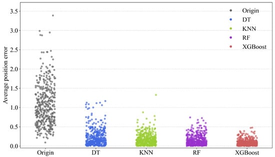 Swarm plot comparing the distribution of position errors for the original (uncompensated) data and after compensation by DT, KNN, RF, and XGBoost models.
