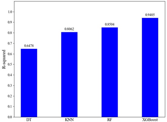 Comparison of the coefficient of determination (R-squared) values for the four machine learning models, indicating goodness-of-fit.