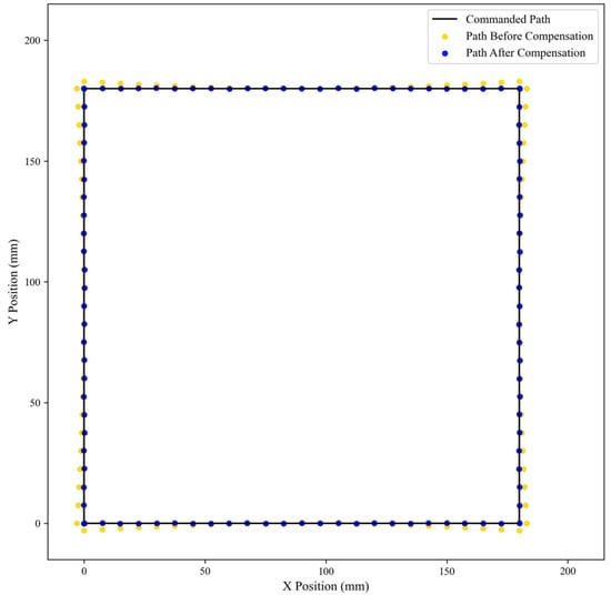 To evaluate the practical effectiveness of the proposed compensation method in a dynamic scenario, a continuous trajectory tracking experiment was conducted. A square path with dimensions of 180 mm × 180 mm was commanded in the robot’s workspace. The actual position of the robot’s end-effector was recorded, both with and without the compensation model activated.