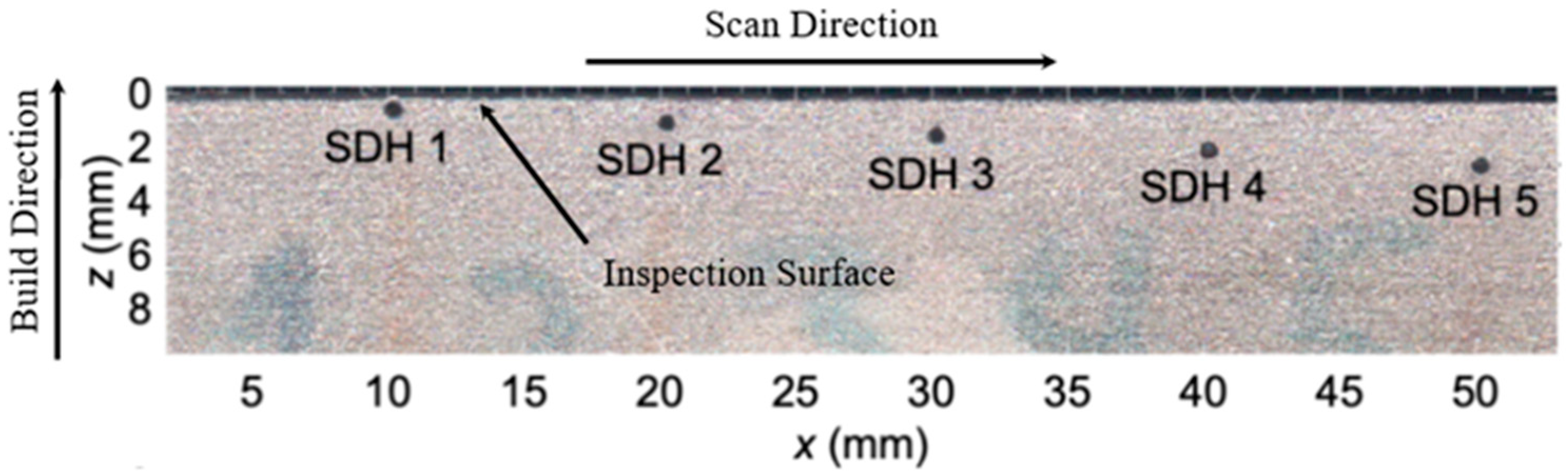 A Laser Powder Bed Fusion (LPBF) AM Ti-5553 reference block was employed in this study to evaluate the detectability of near-surface flaws using ultrasonic inspection techniques. The block was fabricated by the Multi-Scale Additive Manufacturing Laboratory at the University of Waterloo (Ontario, Canada) and was provided by Safran Landing Systems Inc. (Singapore). With dimensions of 30 mm × 30 mm × 190 mm, the block features two sets of five side-drilled holes, introduced post-manufacture to serve as artificial reflectors. Each SDH was drilled with a 0.67 ± 0.05 mm diameter to a nominal length of approximately 8 mm. For the present study, only one set of SDHs was used in the analysis. The entry depths from the inspection surface, measured to the center of each SDH, ranged from 0.40 mm to 2.15 ± 0.05 mm as shown in