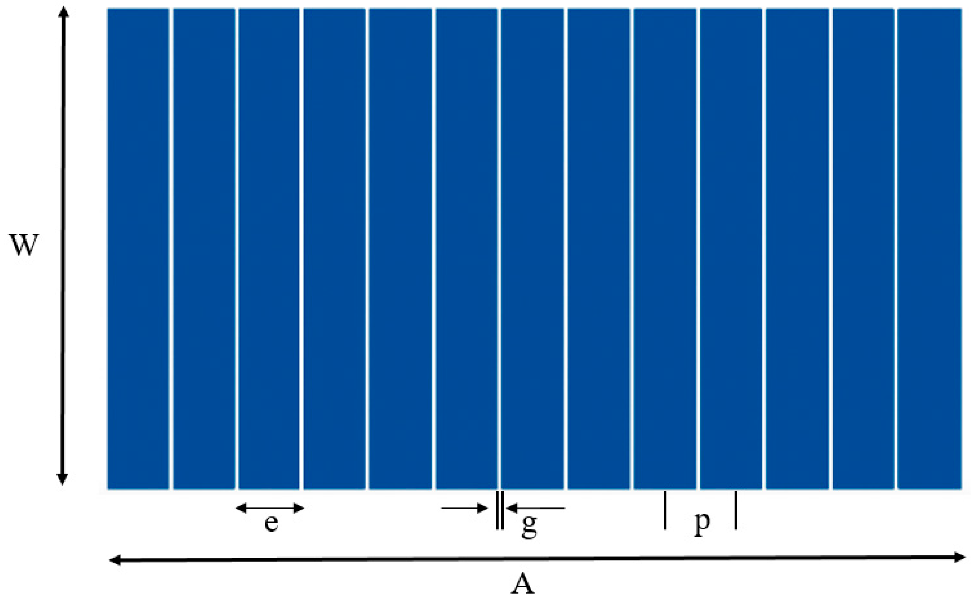 Figure 2, illustrating the dimensional parameters of a linear phased array probe and highlights the main features, including element width (e), pitch (p), kerf (g), active aperture (A), and passive aperture (W) [
