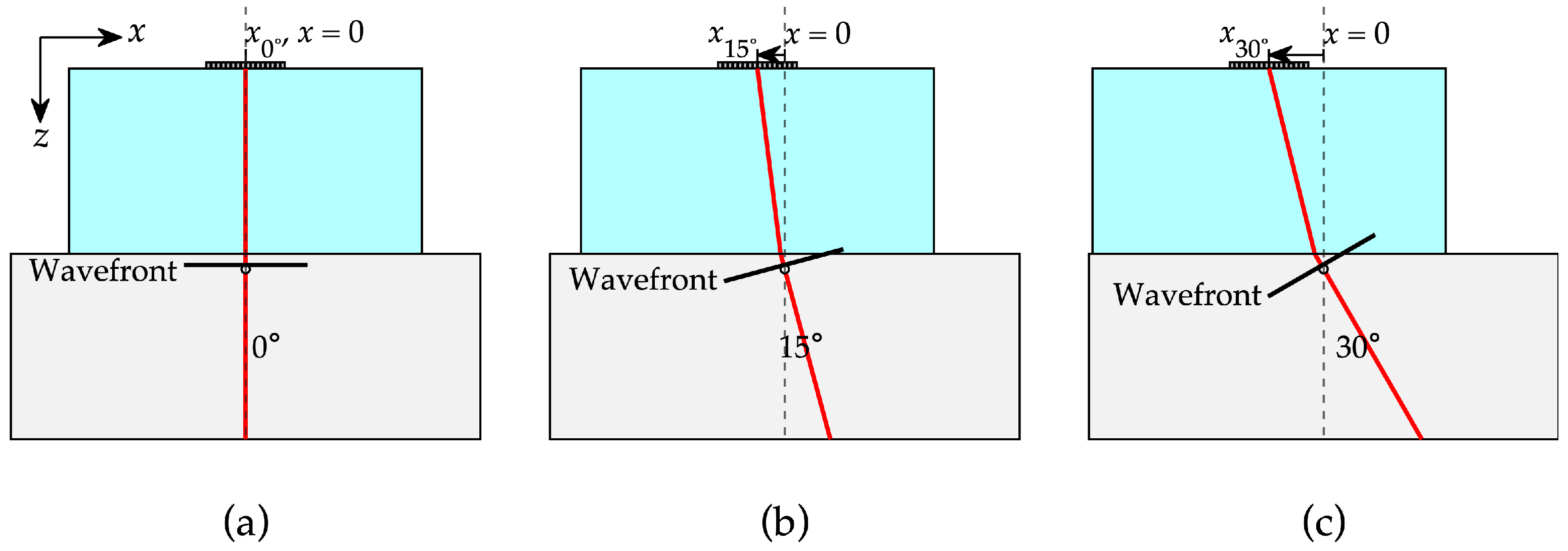 Figure 4. Each scan used 30° sweeps at 0.5° increments, producing 61 unique S-scan acquisitions per scan with a full 16-element aperture and a focal depth of 1 mm. These probe positions were chosen to optimize specular reflection alignment with the SDHs and to reduce interference from front-wall echoes caused by the wedge-block interface.