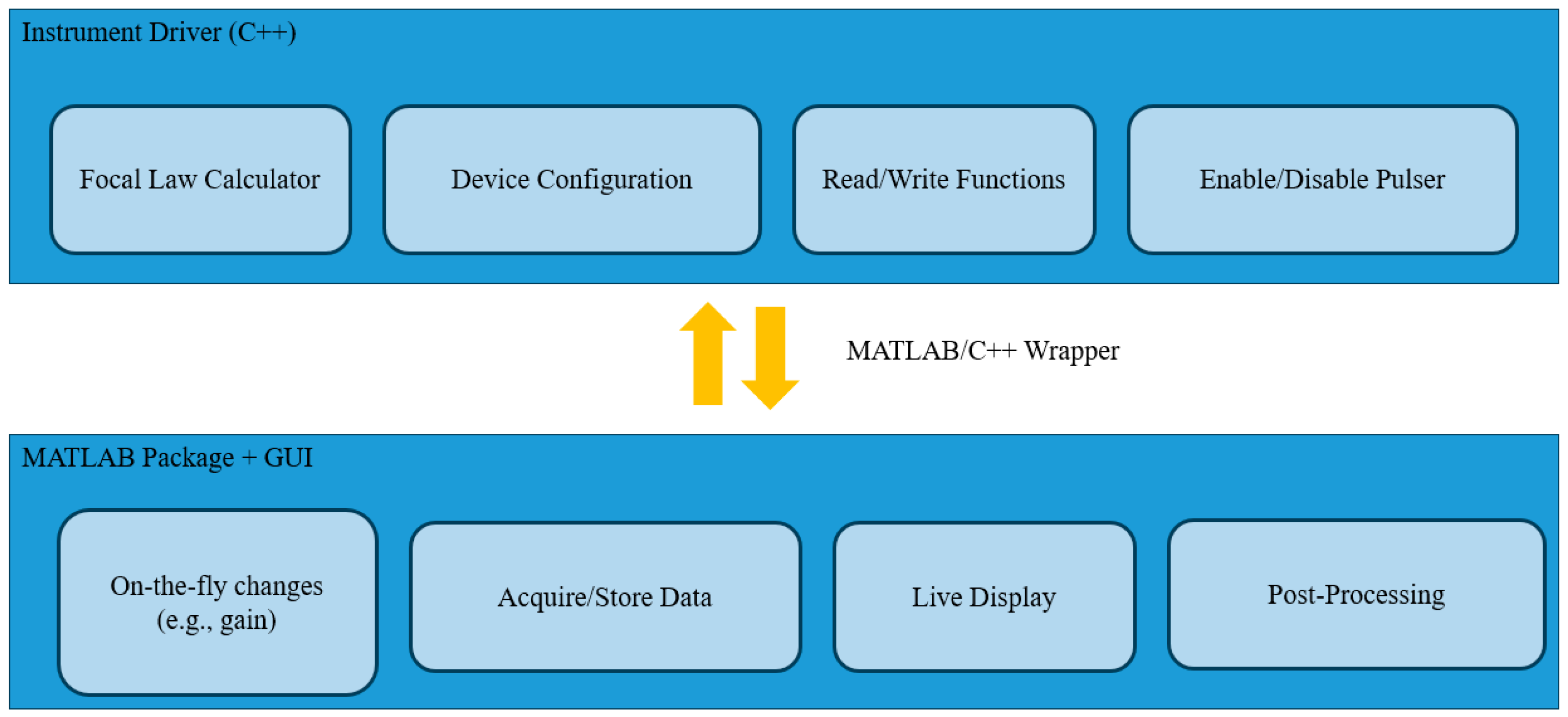 Software development was carried out using a MATLAB/C++ wrapper supplied by AOS, which enabled low-level control over hardware operations and direct interaction with the data acquisition components. Building on this foundation, a custom MATLAB-based graphical user interface (GUI) was developed to manage the acquisition process. The GUI allowed streamlined control over system parameters, real-time signal visualization, and execution of FMC across varying probe configurations. The in-house implementation of the TFM algorithm developed in MATLAB is illustrated in