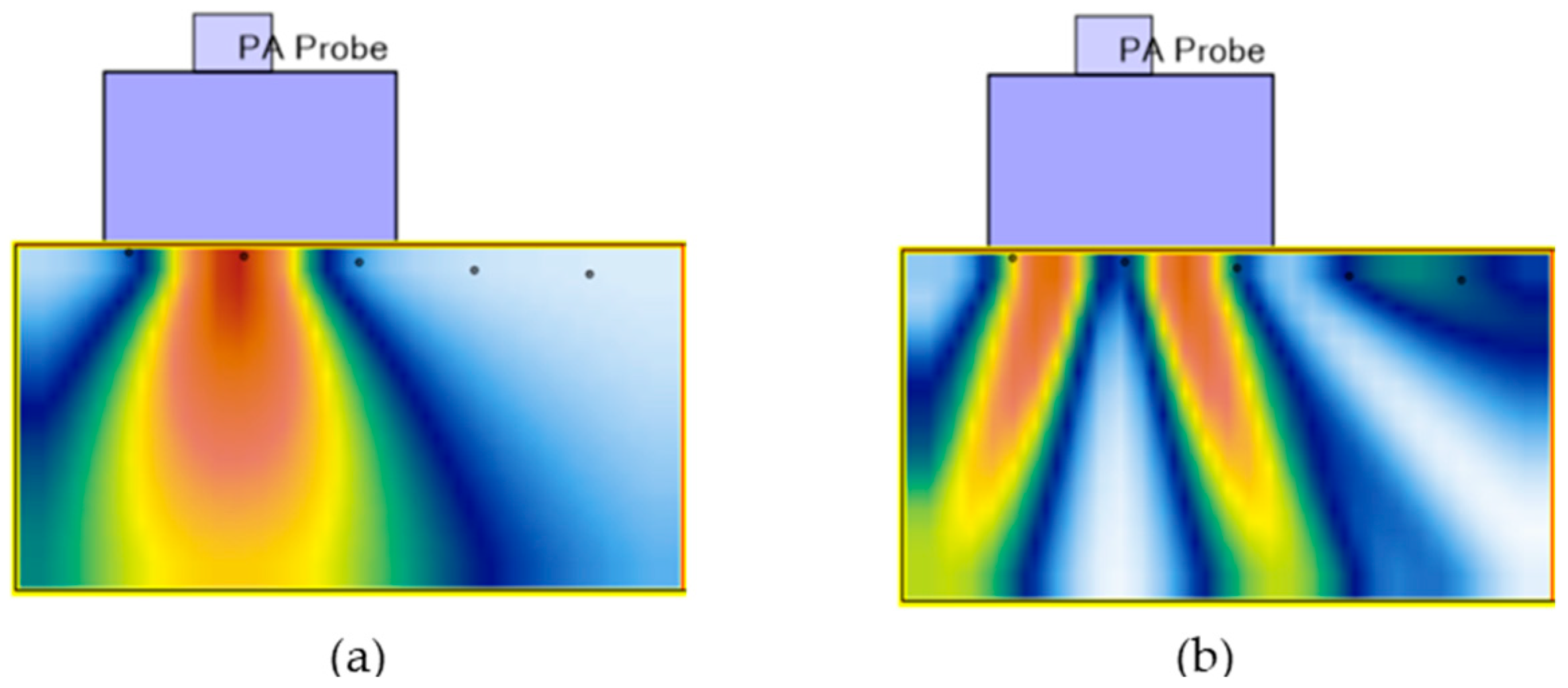 14]. However, conventional single-element UT techniques often struggle with near-surface flaw resolution due to front-wall echo interference and beam steering. To overcome these challenges, advanced array-based techniques—such as PAUT and near-surface Total Focusing Method (TFM)—have emerged as powerful alternatives [