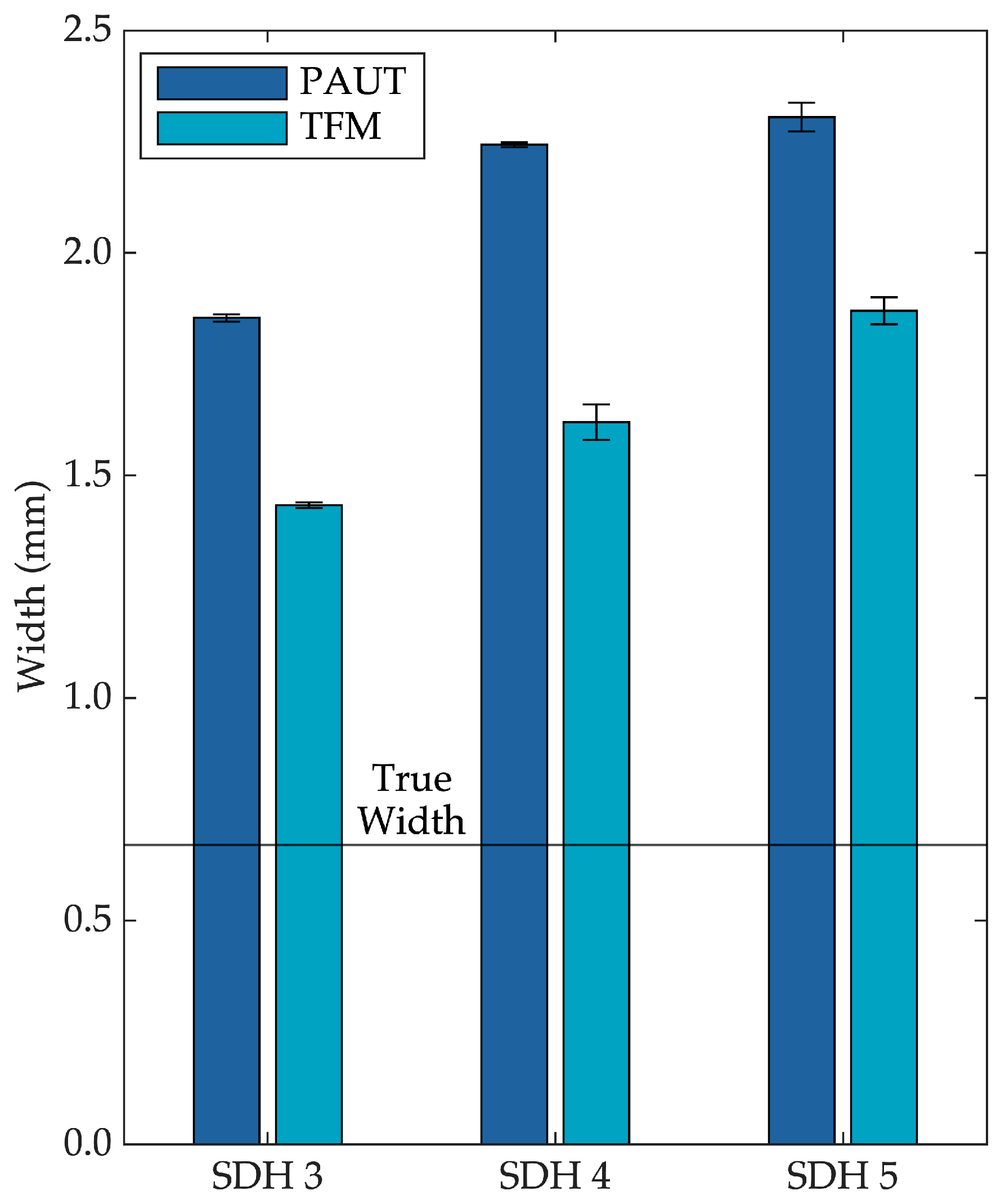 55]. Although implementing such 3D analysis was beyond the scope of this study, future work will explore volumetric TFM and XCT reference scans to provide absolute sizing benchmarks. These approaches are consistent with current AM guidance (ISO/ASTM TR 52905 [