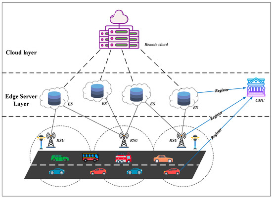 - The cloud management center (CMC) serves as the cloud service provider and management authority for the entire vehicle-to-everything (V2X) computing task offloading system. All entities must register here before entering the system to obtain their unique, legitimate credentials.