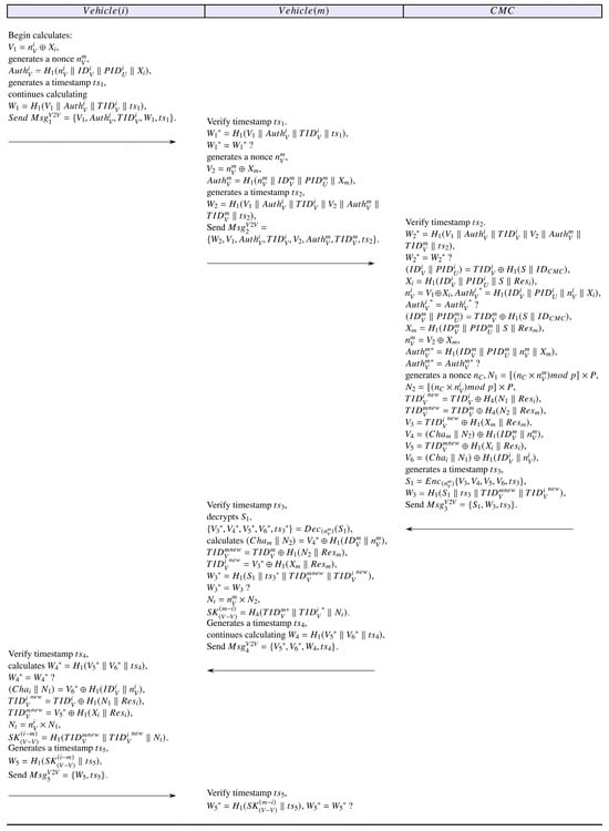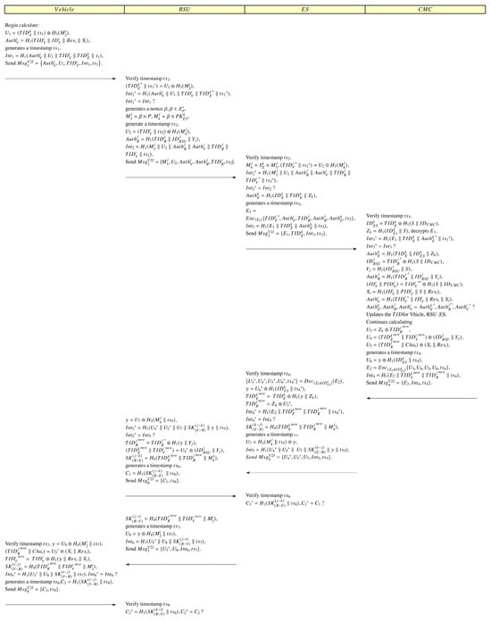 RRP-2: Upon receiving , CMC computes , then selects a random number , and further calculates and . Finally, it transmits to the RSU via a secure channel and publishes to the system.