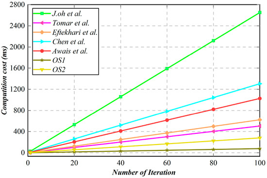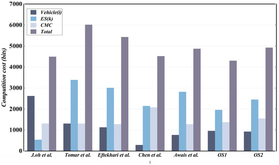 In OS1, the messages that need to be exchanged between the requesting vehicle, ES, and CMC include , , , and . The sizes corresponding to the messages are (256 + 288 + 256+ 128 + 32 = 960 bits), (800 + 256 + 128 + 32 = 1216 bits), (1392 + 128 + 32 = 1552 bits), and (336 + 256 + 128 +32 = 752 bits), respectively; therefore, the total communication overhead is 4480 bits. Similarly, in OS2, the messages that need to be exchanged between the requesting vehicle, the auxiliary vehicle, and the CMC include , , , and . The sizes corresponding to the messages are (256 + 256+ 256+ 128 + 32 = 928 bits), (128 + 256 + 256 + 256 + 256 + 256 + 256 + 32 = 1696 bits), (1216 + 128 + 32 = 1376 bits), and (256 + 336 + 128 +32 = 752 bits), respectively; as a result, the communication overhead in OS2 is 4752 bits. For the other schemes we compare, we employ the same computational approach. A comparative analysis of communication overhead is presented in Table 8 and Figure 6.