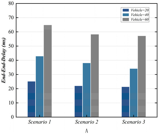 EED measures the average time taken for a data packet to travel from its source point (sender) to its destination point (receiver). Its calculation method is defined as . Here, denotes the total number of packets, represents the transmission time of packet , and denotes the reception time of packet . Figure 7 shows the performance of EED under three scenarios.