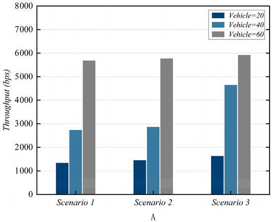 Throughput is defined as the amount of effective data transmitted within a network per unit of time. It serves as another core metric for measuring network performance, fundamentally differing from EED. The calculation method for throughput is defined as . Here, denotes the number of received data packets, represents the size of the received data packets, and indicates the total duration of the statistical period. The throughput performance under the three scenarios is shown in Figure 8.