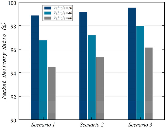 PDR is another core metric for measuring network stability and reliability, distinct from EED and throughput. Its mathematical representation for calculation is . It is defined as the ratio of the number of packets successfully received by the destination (receiver) to the number of packets transmitted by the source (sender) within a specific time period. Figure 9 shows PDR performance under three scenarios.