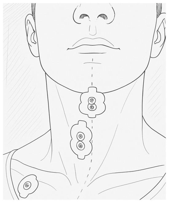 A specific protocol was created to collect electromyographic data to assess the kinematics of the extrinsic laryngeal muscles during phonatory tasks and vocal techniques. This protocol was adapted from previous models, validated by a panel of experts (content validity), and tested with an accelerometer (criterion validity). Pre-tests with three volunteers allowed for adjustments to the procedures and tasks. Considering the size and positioning of the extrinsic muscles of the larynx, and based on the tests conducted, it was decided to monitor muscle groups rather than isolated muscles. The protocol was structured in such a way as to collect two signals: one for the SHM group, namely the digastric and mylohyoid muscles, and another for the IHM group, made up of the sternohyoid, thyrohyoid and omohyoid muscles. The bipolar electrodes were 2 cm apart and placed as shown in the following image.
