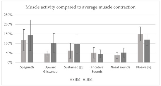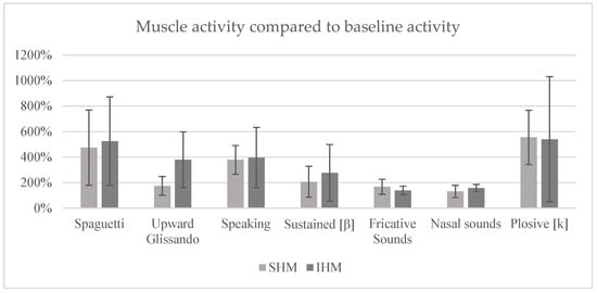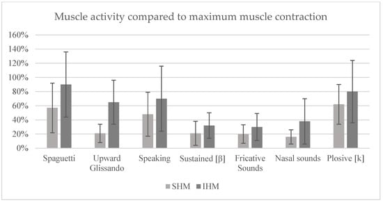Analysing the signal in relation to the speech task (mean value) (Figure 4), it was found that the technique with the highest recruitment of the SHM was the production of plosive sounds, with 150%, while the ‘Spaghetti’ technique showed the highest activation of the IHM, with 143%. These same techniques also showed 120% recruitment in the IHM and 118% in the SHM, respectively. The prolonged/b/technique resulted in 127% activation in the SHM and 97% in the IHM. The ascending glissando technique showed 47% activation in the SHM and 103% in the IHM. As in the previous analyses, the techniques for producing fricative and nasal sounds were the ones that elicited the least muscle recruitment, with values of 51% and 38% in SHM and 46% and 52% in IHM, respectively.