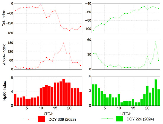 Figure 1 show the variations in geomagnetic activity indices over the two days. As can be seen, during DOY 309 in 2023, the minimum Dst dropped to −163 nT, the peak ap60 reached 179, and the peak Hp60 reached 7.667. During the moderate storm on DOY 226 in 2024, the minimum Dst dropped to −103 nT, the peak ap60 reached 56, and the peak Hp60 reached 5.333.