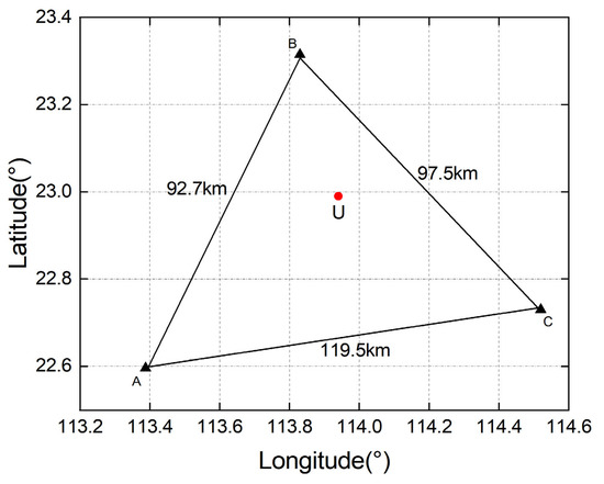 We first apply a self-developed long-baseline URTK algorithm to perform dual-constellation (BDS + GPS), multi-frequency URTK processing on long-baseline observations collected under geomagnetic storm conditions. The experiments use CORS network data from a low-latitude province in southern China on DOY 309 (2023) and DOY 226 (2024), with a sampling interval of 1 s, a daily observation span of 24 h, and an elevation mask angle of 15°, and the carrier-to-noise ratio threshold was set to 45 dB-Hz. Cycle slips were detected using the Melbourne–Wübbena (M–W) method, and the data were processed in simulated kinematic positioning mode. The observing network consists of three reference stations, A, B, and C, and a user station, U. The inter-station distances are listed in