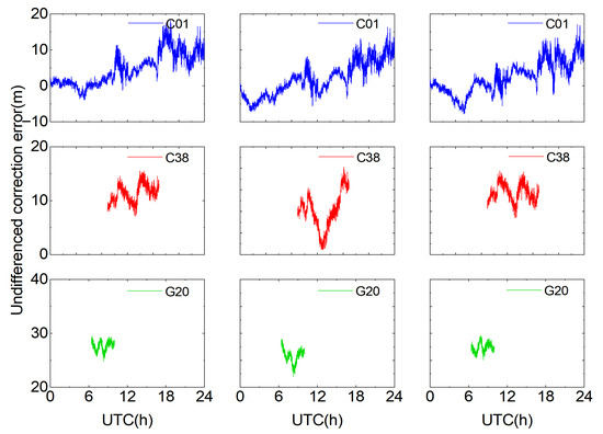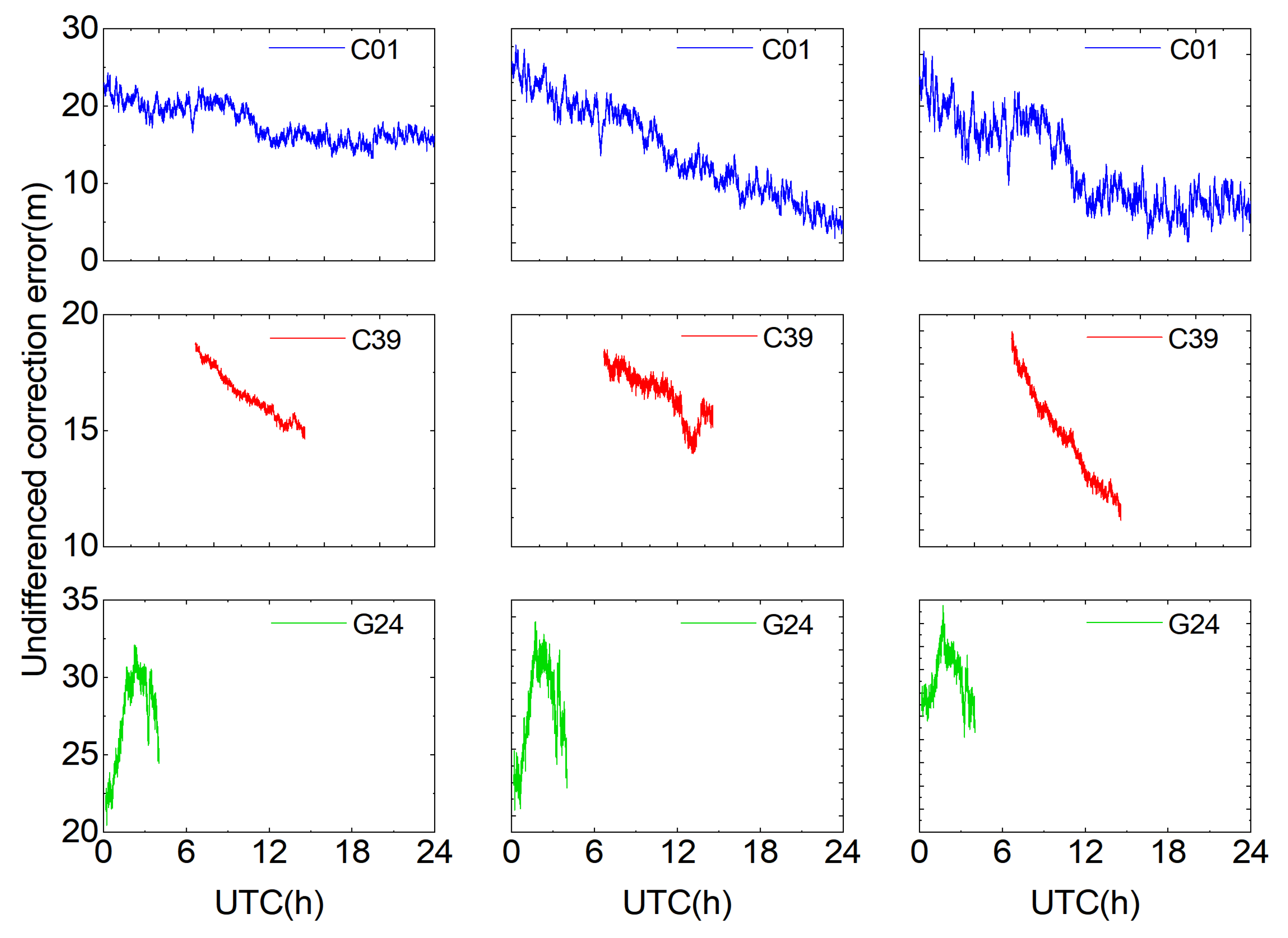 To compute the user’s undifferenced error corrections, the accurately determined double-difference integer ambiguities are first converted to undifferenced integer ambiguities, after which the undifferenced composite error corrections for each reference station are obtained. Taking as examples the periods of continuous visibility on the first frequency for satellites C01, C38, and G20 on DOY 309 (2023) and satellites C01, C39, and G24 on DOY 226 (2024) at reference stations A, B, and C (