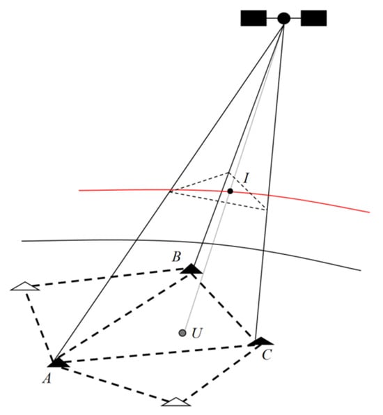 Figure 7, where A, B, and C represent the reference stations, U denotes the rover station, and I indicates the ionospheric pierce point.