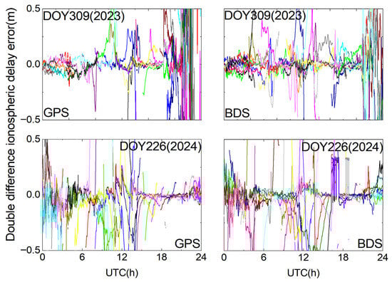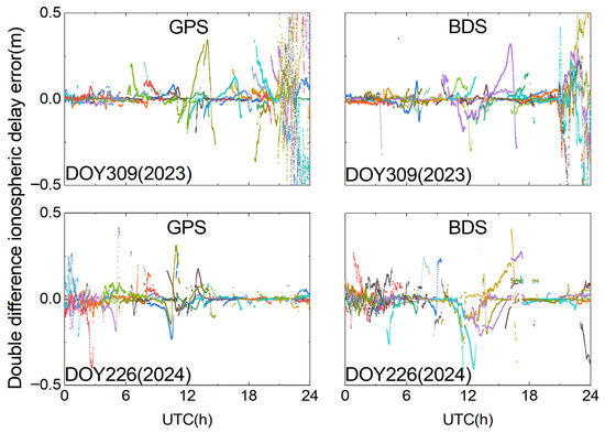 Figure 8, the double-differenced ionospheric delay variations in the BDS and GPSs on DOY 226 (2024) are less intense than those on DOY 309 (2023). However, noticeable variations are still observed between 0 and 4 h, and ionospheric disturbances affecting some satellites are also detected between 10 and 14 h, which are likely unrelated to geomagnetic storm activity. Although ionospheric disturbances can also occur during non-storm periods, they are typically regional, short-lived, and weak. In contrast, geomagnetic storms trigger large-scale, intense, and long-lasting disturbances that significantly degrade the spatial correlation of ionospheric delays across a CORS network. Therefore, this study focuses on geomagnetic storm-induced disturbances as the primary factor affecting long-baseline URTK performance, with non-storm periods considered only occasionally relevant for minor disturbances.