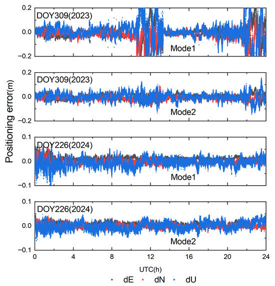 Figure 10, it is evident that during the geomagnetic storm on DOY 309 (2023), Mode 1 exhibits numerous outliers: the maximum positioning errors reach 28.2 cm in the E direction, 35.6 cm in the N direction, and 50.4 cm in the U direction. Mode 2 also shows some outliers during the storm period; however, for most epochs, the positioning errors remain within 10 cm relative to Mode 1. It is clear that Mode 1 struggles to meet high-accuracy positioning requirements during geomagnetic storms, whereas Mode 2 is scarcely affected; in non-storm periods, the positioning results of both modes are more stable. This finding is mainly the result of Mode 2 estimating residual atmospheric terms on the user side, greatly attenuating the impact of residual atmospheric errors—left after applying the regional undifferenced correction model—on ambiguity fixing. Likewise, the statistics presented in