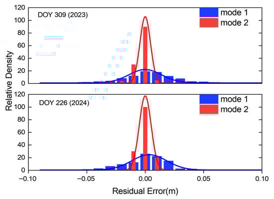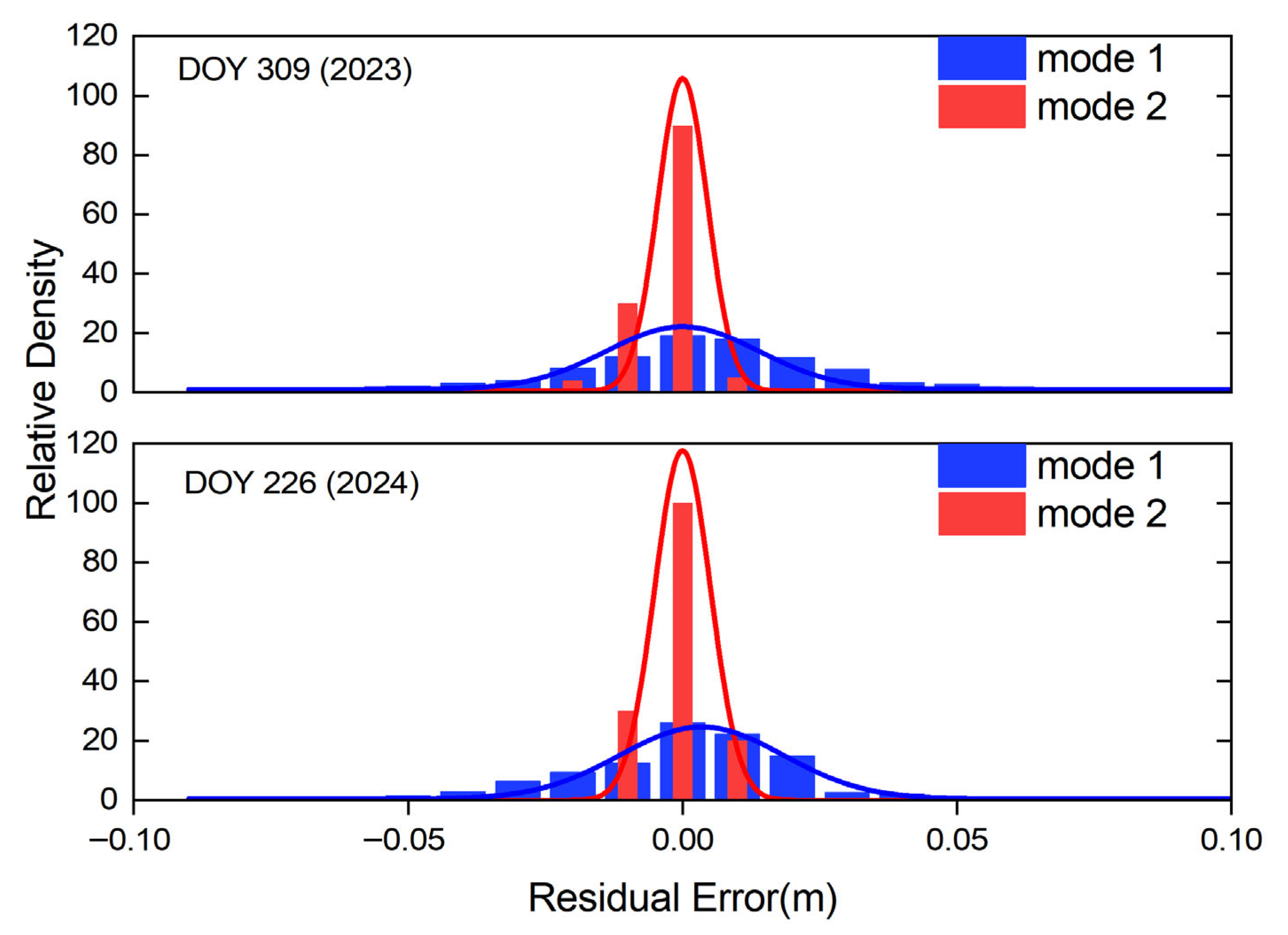 Figure 11, clear differences can be seen in the relative density of the post-fit positioning residuals for the two modes on DOY 309 (2023) and DOY 226 (2024). Combined with the preceding analysis, this finding is mainly the result of Mode 1 having difficulty correctly fixing the user-side integer ambiguities during geomagnetic storms. Considering both the residual magnitudes and their normal distribution characteristics, most residuals in Mode 2 are within 1 cm, and the normal distribution of their relative density is markedly superior to that of Mode 1.