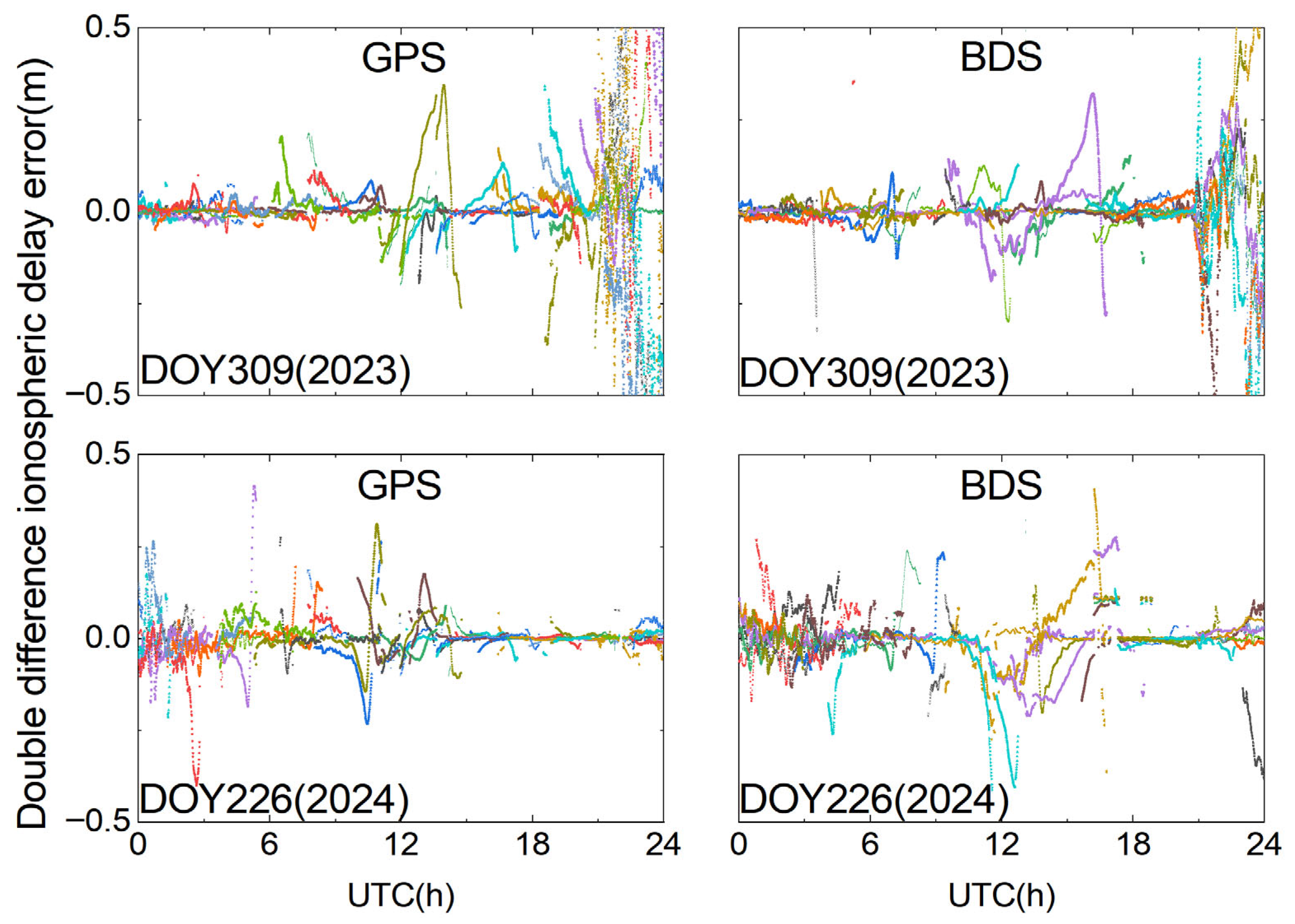Figure 9, it still indicates that under geomagnetic storm conditions, the accuracy of user-side double-differenced ionospheric corrections obtained through conventional interpolation methods is insufficient, necessitating additional estimation of atmospheric delay parameters on the user side.