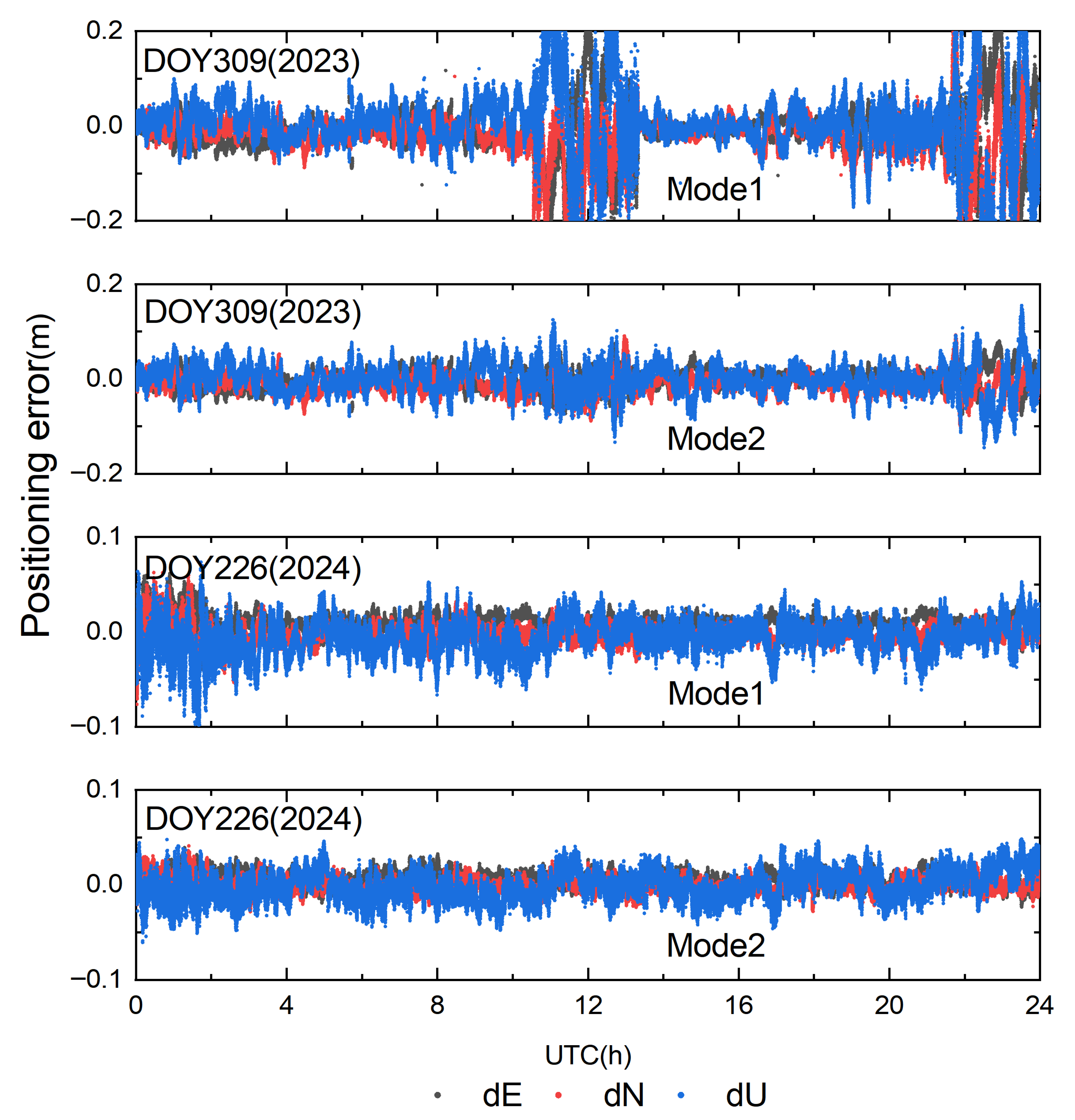 Table 2 clearly show that Mode 2 outperforms Mode 1 in positioning accuracy, with RMS improvements of 63.7%, 60.7%, and 64.4% in E, N, and U, respectively. During non-storm periods, the user-side positioning accuracy of Mode 1 can meet centimeter-level requirements, and its model complexity is lower than that of Mode 2. It should be noted that most current terminals still adopt Mode 1; thus, further implementation and verification on the terminal side are needed for future applications. Compared with Mode 1, Mode 2 improves the ambiguity fixing rate by 23.6% and 5.6% on DOY 309 (2023) and DOY 226 (2024), respectively.