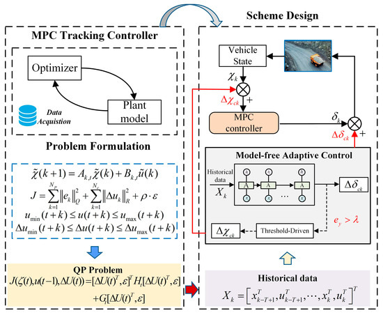 An MPC-MFAC tracking control strategy is designed in this paper, whose architecture is illustrated in Figure 2. It can be found that the model-driven and data-driven approaches are hybrid synergized in the architecture of the proposed method, ensuring high-precision trajectory tracking in complex mining environments. Firstly, a basic controller with consideration of vehicle constraints based on MPC is constructed to coordinate optimization across multiple future control horizons. Then the complex trajectory tracking tasks are changed into the QP problem in each sampling interval based on data acquisition. Moreover, the MFAC compensation strategy is introduced to correct discrepancies between actual vehicle trajectories and model-predicted trajectories, balancing control precision and computational efficiency simultaneously.