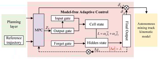 Data-driven methods avoid the need for explicit vehicle dynamic or kinematic models, which are widely applied in trajectory tracking. As a classic data-driven control method [18], a PID controller based on trial and error was designed by Wael et al. [19], realizing trajectory-tracking accuracy on an expressway. However, the inherent linear characteristic of the PID limits its application in strongly nonlinear and highly coupled operational environments with variable payloads and dynamic disturbances for autonomous mining trucks [20]. Some studies have attempted to learn and summarize experience and patterns from collected data, and then the experience and patterns are incorporated into the control system [18]. Pan et al. [21] proposed a polynomial-based trajectory-fitting method based on past trajectories to design transformation functions, ensuring the planned trajectory’s safety and collision avoidance. However, self-learning relies on lots of offline data and pre-training, and it is confined to fixed scenarios. Moreover, the control performance of self-learning drops sharply under dynamic disturbances or domain shift, limiting application to complex mine-site trajectory tracking [22]. As another scheme of data-driven methods, model-free adaptive control (MFAC) [23] has been widely applied in robotics, UAVs, and vehicle trajectory tracking. MFAC can learn complex time dependencies from training data automatically without manual mathematical modeling and prior knowledge, extracting key temporal features to predict accurately while maintaining prediction stability under input uncertainty. Wang et al. [24] designed a local path-planning algorithm based on a model-free network to forecast surrounding vehicles’ trajectories, which is validated under both lane-change and longitudinal-collision scenarios at low and high speeds. Zhou et al. [25] proposed a model-free finite-time saturation control method with natural constraint, aiming to reduce vehicle vibration and enhance passenger comfort. However, objects of the studies mentioned above are passenger vehicles on a structured pavement, and there are relatively few relevant studies on autonomous mining trucks.