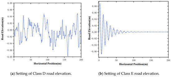 To further demonstrate the impact of different road conditions and driving scenarios on the controller, Class E and Class B road profiles are implemented in the simulations. They can reflect the severe unevenness with the road roughness coefficient cycle and cycle, and their road elevation settings are illustrated in Figure 9.