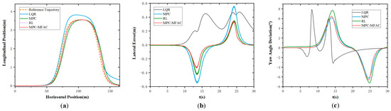 To evaluate the proposed strategy under large payload variations, comparative tests were conducted on a Class B road at 20 km/h with a 55,000 kg load, as shown in Figure 13. The RL-based controller exhibits severe oscillations and large tracking errors, while the MPC controller shows moderate but noticeable deviations under load and road disturbances. In contrast, the proposed MPC-MFAC method achieves smoother trajectories, smaller errors, and superior stability, demonstrating strong robustness to complex road conditions and significant payload changes.