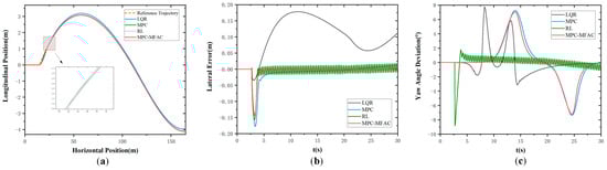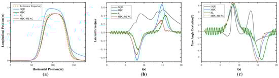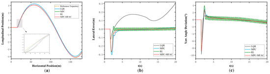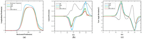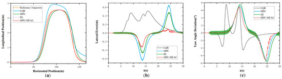 Figure 5 illustrates the simulation results at the speed of 20 km/h at Class D road elevation under the double line-shifting condition. As can be seen from Figure 5, the LQR exhibits big tracking errors and struggles to adapt to complex operating conditions. Meanwhile, MPC demonstrates suboptimal performance in curved path tracking with pronounced lateral deviations. In contrast, the proposed MPC-MFAC, despite exhibiting trajectory fluctuations in error compensation, delivers the highest overall accuracy with the least variability among comparative methods. Figure 6 illustrates the simulation results at the speed of 20 km/h at Class E road elevation under the double line-shifting condition. In contrast, the proposed MPC-MFAC, despite exhibiting trajectory fluctuations in error compensation, achieves the highest overall accuracy among comparative methods when subjected to road conditions and driving scenarios.