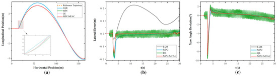 In order to further verify the effectiveness of the proposed strategy under large payload variations of mining trucks, comparative tests were conducted on a Class D road profile at a speed of 20 km/h with a heavy load of 50,000 kg, as illustrated in Figure 8. It can be observed that the reinforcement learning (RL)-based controller suffers from severe trajectory oscillations, resulting in poor stability and larger lateral tracking errors. The MPC controller achieves moderate performance but still exhibits noticeable deviations from the reference path under the combined effects of load and road disturbances. In contrast, the proposed MPC-MFAC method maintains the smallest tracking errors and better stability, with smoother trajectories that remain closely aligned with the reference. This comparison further demonstrates the robustness of the proposed framework in handling complex road conditions and significant payload variations.