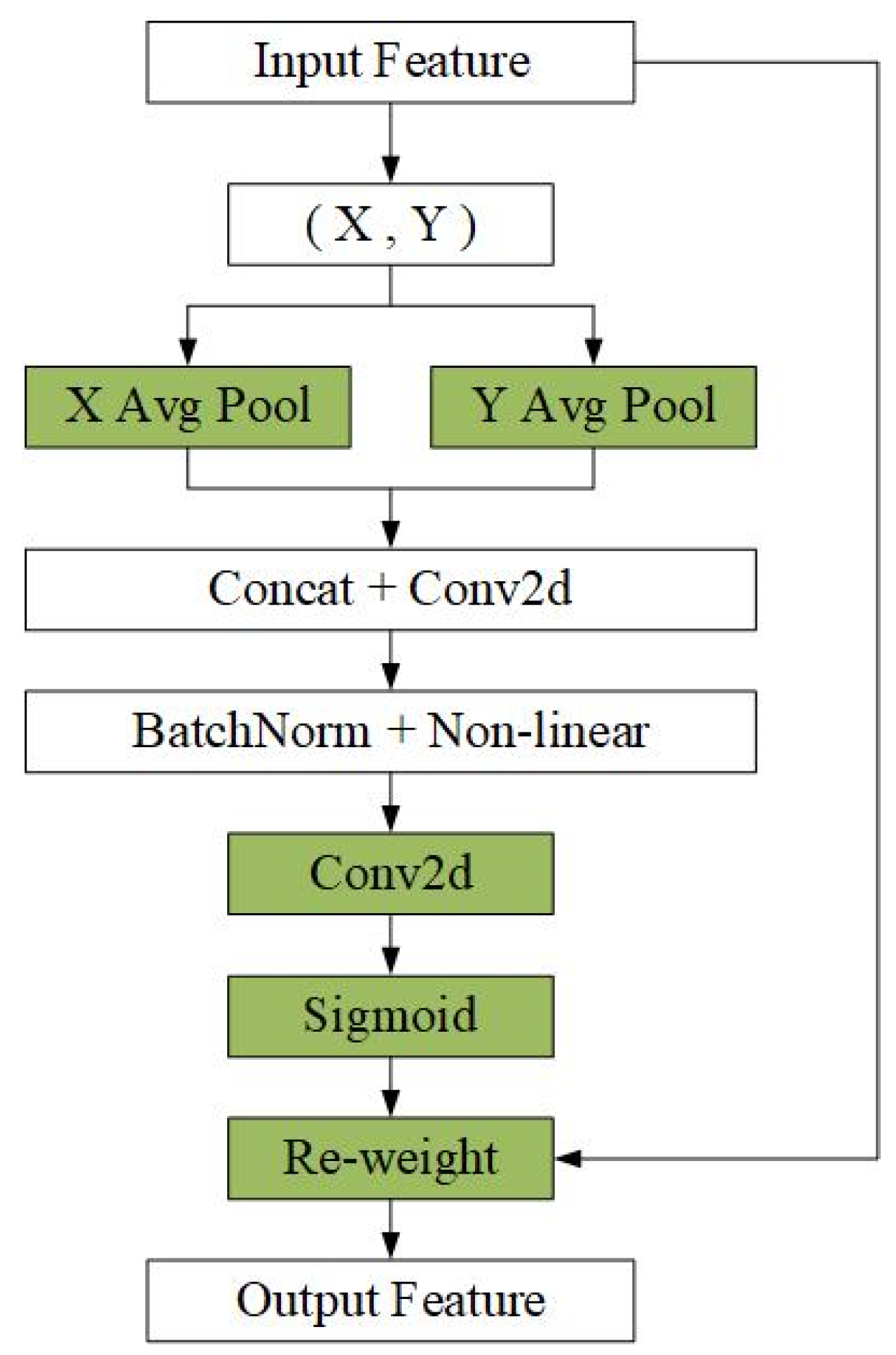 Coordinate attention encodes channels and establishes dependencies over long distances through accurate positional information. The goal of coordinate attention is to encode accurate positional information to establish dependencies between channels and distances during feature extraction. The introduction of coordinate information enables the model to better utilize position information to establish dependencies between channels, thus improving the localization and recognition performance. To better understand the coordinate attention mechanism,