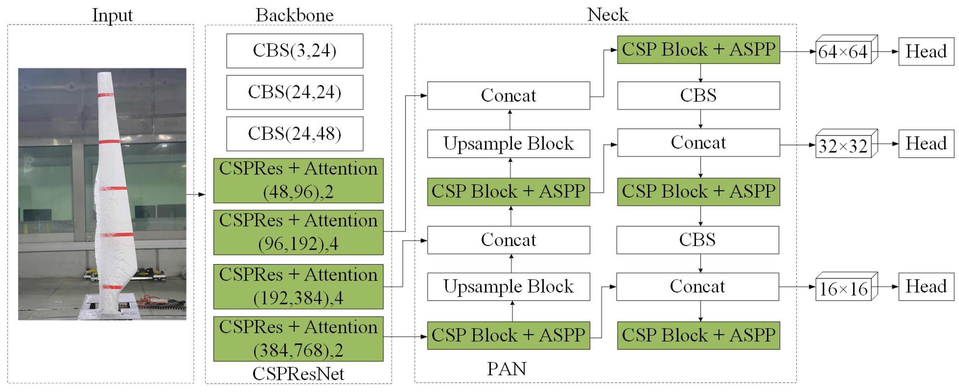 An improved PP-YOLOE network is developed with multiple innovations over the original version, including embedding a Coordinate Attention (CA) mechanism in the CSPRes backbone and introducing an Atrous Spatial Pyramid Pooling (ASPP) module into the CSPBlock of the PANet structure; these enhancements markedly strengthen the model’s ability to detect blade icing.