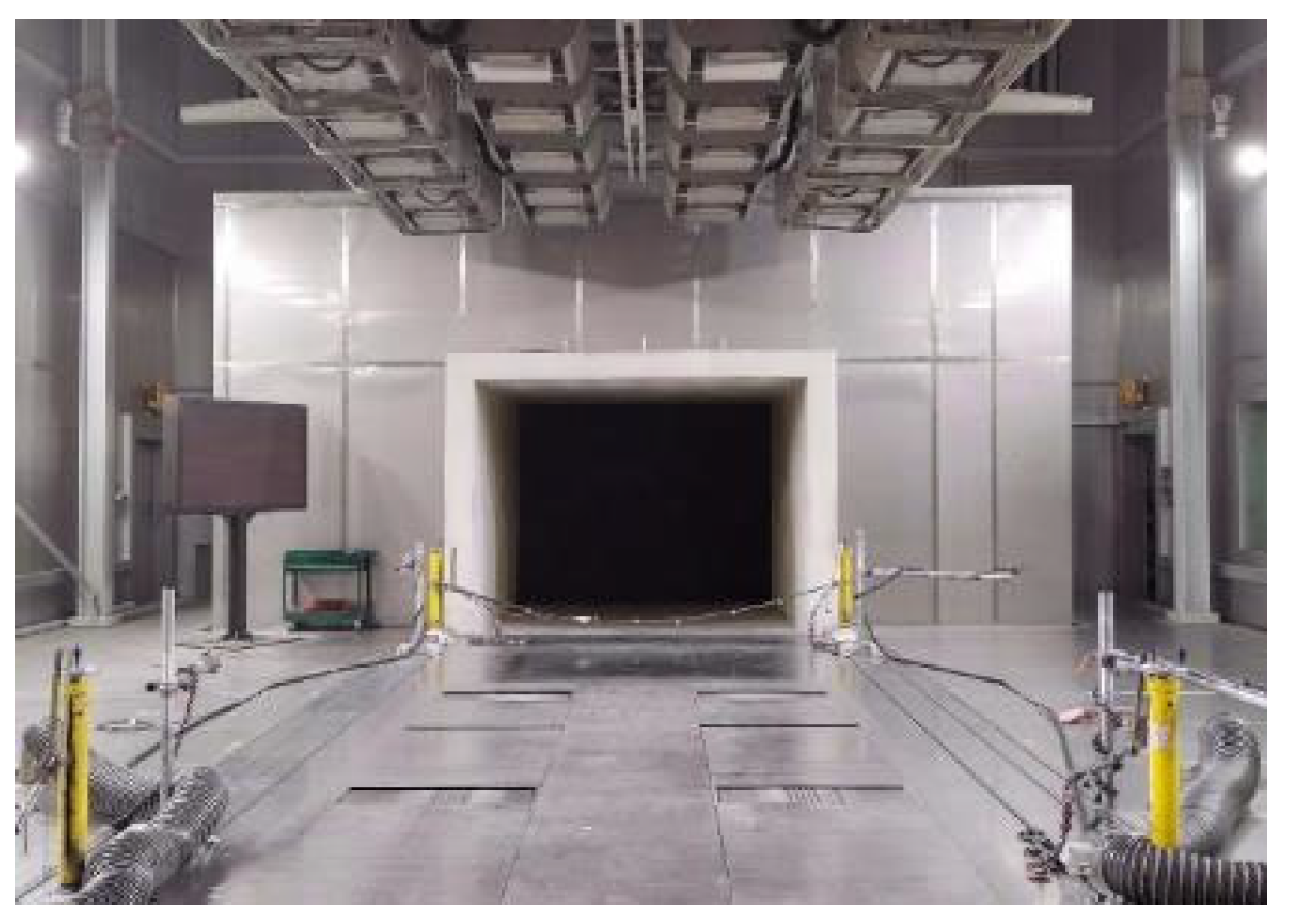 Figure 6 shows the test section of the environmental wind tunnel laboratory at the Haval Technology Center. The system utilizes a fan with a total power of 2 MW to provide power for airflow, and the maximum wind speed of the spout can reach 250 km/h. The system realizes temperature regulation through a heat exchanger, which can realize the temperature to be transformed between −40.0 °C~60.0 °C. The laboratory has a super-large-scale spout and test section and contains a water mist injection system, rain and snow simulation system, etc.