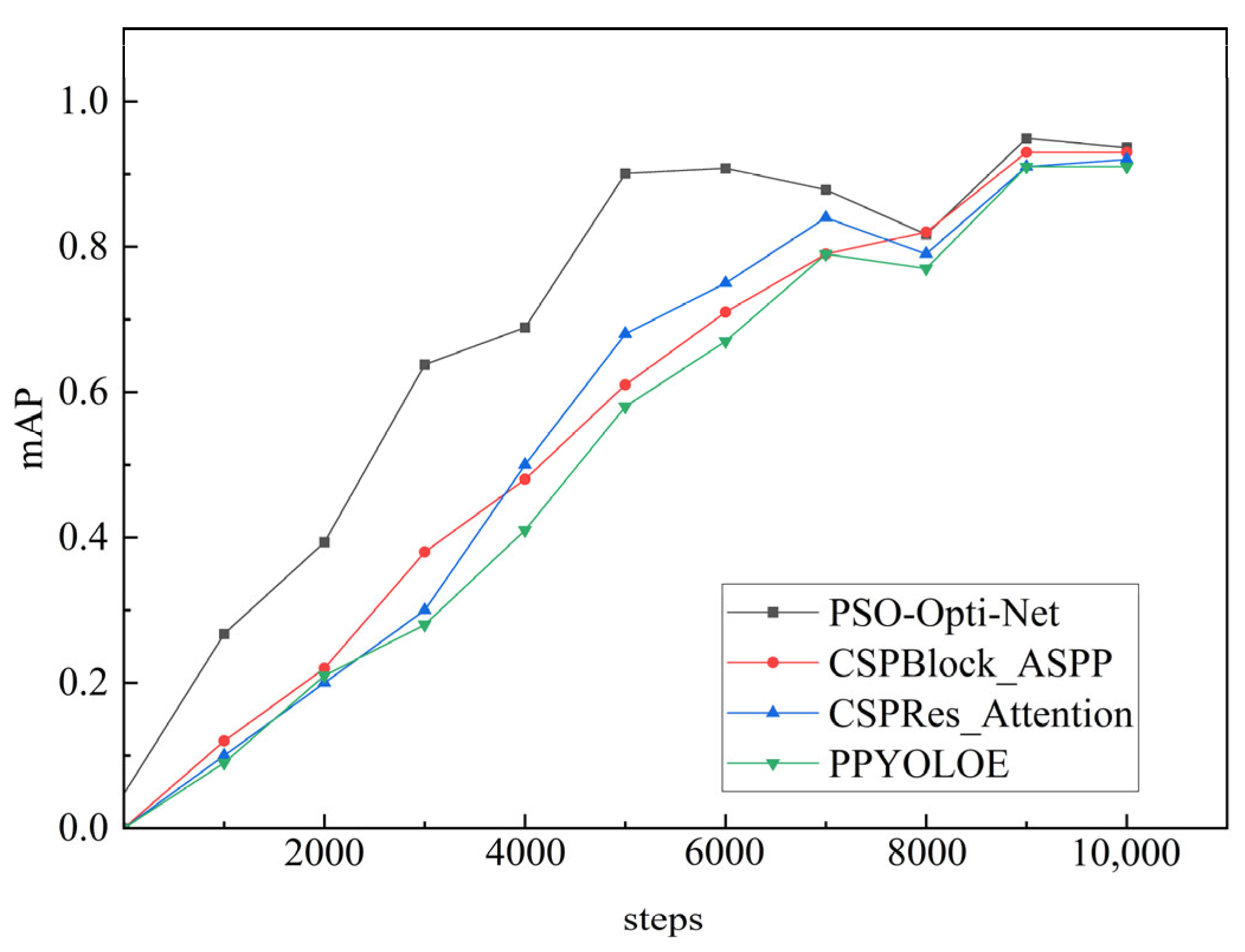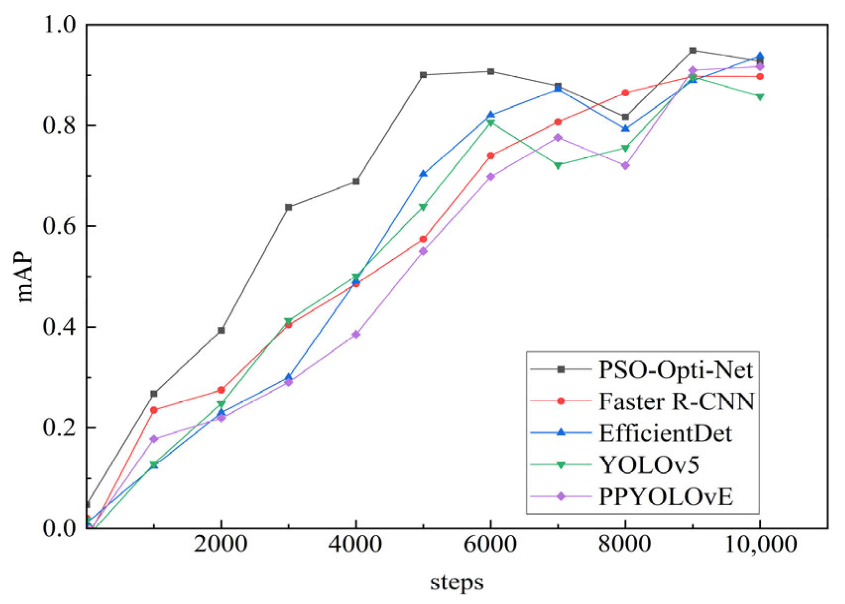 Based on the comparison experiments, it is evident that the P-R curve of the PSO-Opti-Net network consistently outperforms that of PPYOLOE, Faster R-CNN, EfficientDet, and YOLOv5. This indicates that the proposed model in this paper operates optimally.