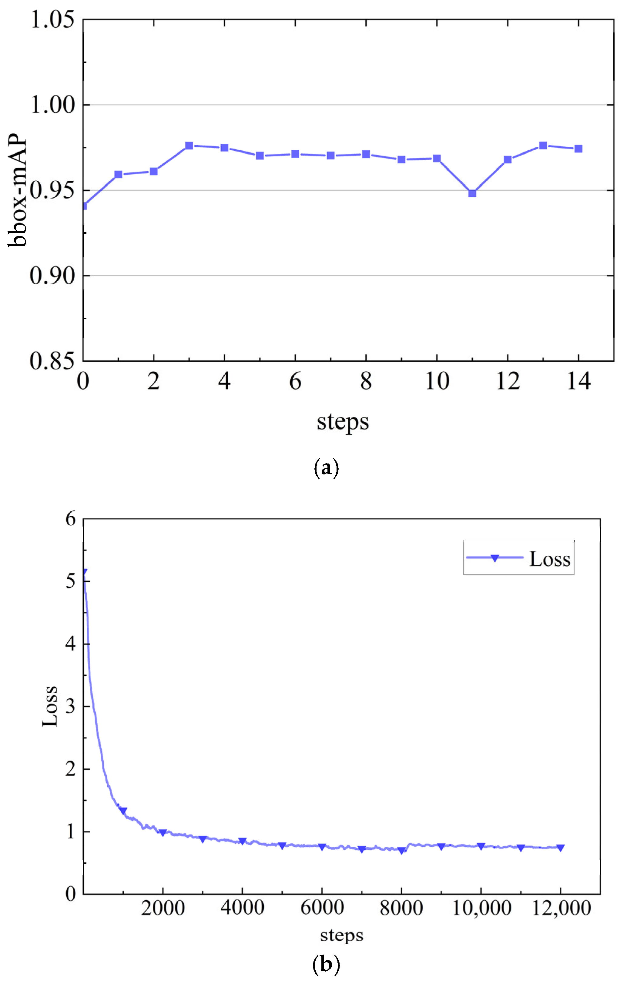 Figure 10, the process of training the model is visualized. Our experiments have shown that mAP has reached a relatively high level and remains stable over multiple iterations. The stability of mAP on the validation set suggests that the model has effectively learned the features within our dataset and converged well, without showing signs of significant overfitting to the training data. The fact that mAP has not undergone significant changes beyond this point is a powerful indicator of convergence. Similarly, the loss function measures the difference between the predicted label and the true label and converges to a stable value after 10,000 iterations. The loss curve tends to stabilize, indicating that the model no longer shows significant improvement in reducing prediction errors. This is a sign of convergence in machine learning models. The model checkpoint with the highest validation mAP of 0.976 was saved during training. For final evaluation on the test set, this model achieved a stable and generalizable mAP of 0.94, which is the value reported in our comparative results.