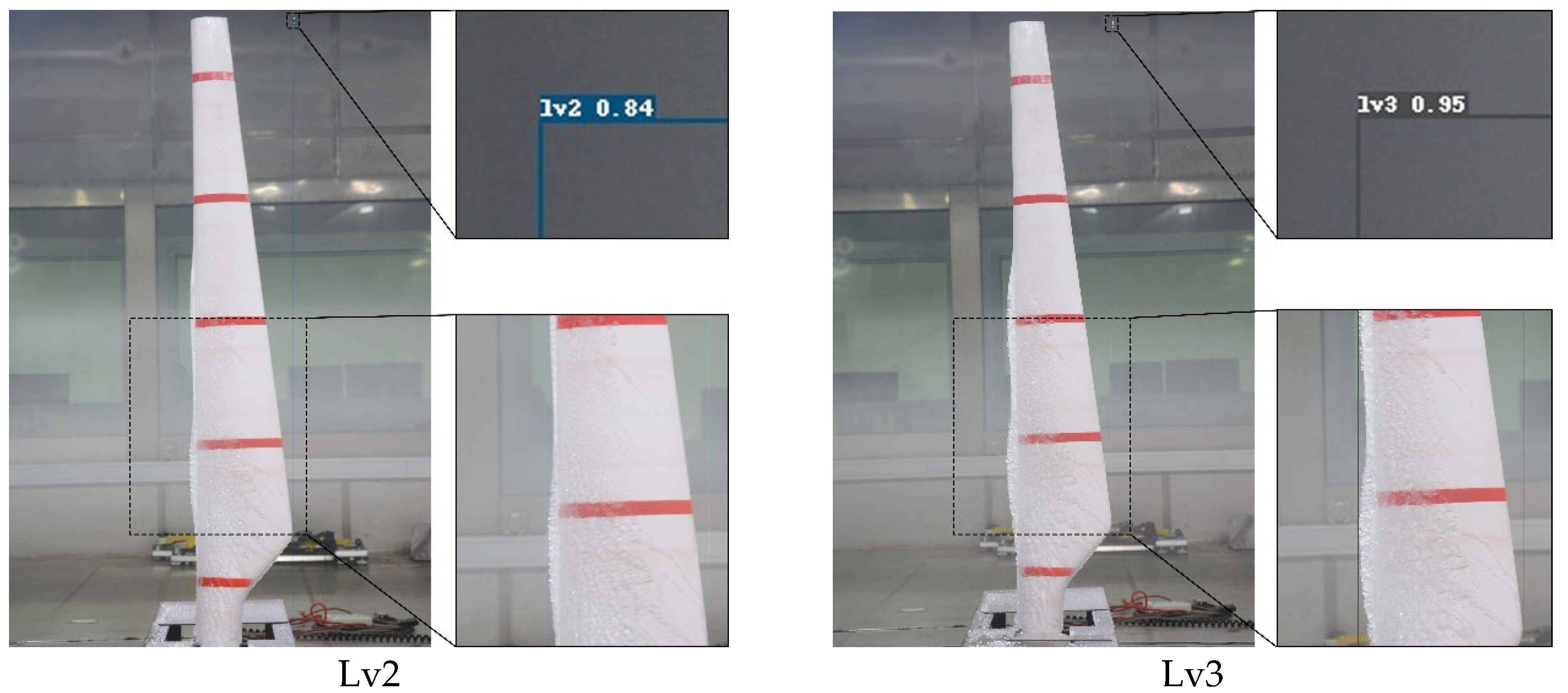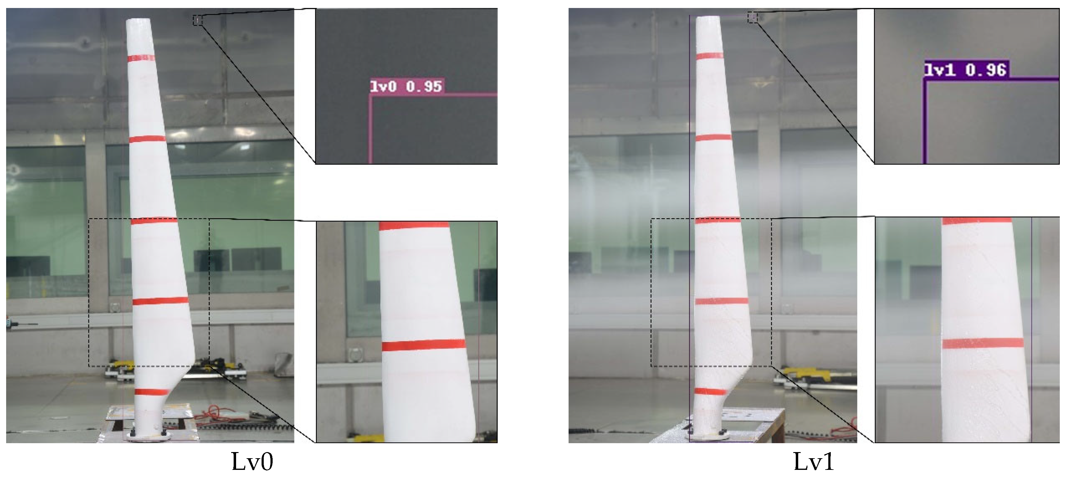 Figure 7. During the screening process, a set of strict quality criteria was applied to the initial 3669 images. Images were discarded if they exhibited significant motion blur, poor focus, over or under-exposure, or contained reflections that obscured the details of ice accretion on the blade surface. Furthermore, only images providing a clear, perpendicular view of the blade’s leading edge were retained to ensure consistency in representing the icing state. This systematic screening process yielded a final high-quality dataset of 3000 images. To ensure the consistency and reliability of the annotations, a standardized labeling protocol was established. Initially, two experienced researchers independently annotated a random subset of 200 images (approximately 7% of the dataset). The annotations were then compared, and any discrepancies were discussed to resolve ambiguities and refine the labeling guidelines. This finalized protocol was subsequently used by one researcher to annotate the entire dataset, with the second researcher performing spot-checks to maintain high-quality standards throughout the process. Among them, there are 806 images belonging to lv0, 730 images belonging to lv1, 694 images of lv2, and 670 images belonging to lv3.