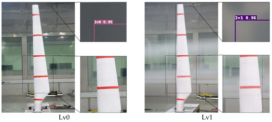 - Divide the dataset: To provide a more precise depiction of the various ice-covering conditions, the images captured were categorized during the experiment at 0 min, 20 min, 40 min, and 60 min into four levels: lv0, lv1, lv2, and lv3. This was based on the time at which the experiment was conducted. In this case, ice covering is represented by different levels: lv0 indicates no ice covering, while lv1, lv2, and lv3 correspond to mild, moderate, and severe ice-covering conditions. Sample pictures are displayed in Figure 7. During the screening process, a set of strict quality criteria was applied to the initial 3669 images. Images were discarded if they exhibited significant motion blur, poor focus, over or under-exposure, or contained reflections that obscured the details of ice accretion on the blade surface. Furthermore, only images providing a clear, perpendicular view of the blade’s leading edge were retained to ensure consistency in representing the icing state. This systematic screening process yielded a final high-quality dataset of 3000 images. To ensure the consistency and reliability of the annotations, a standardized labeling protocol was established. Initially, two experienced researchers independently annotated a random subset of 200 images (approximately 7% of the dataset). The annotations were then compared, and any discrepancies were discussed to resolve ambiguities and refine the labeling guidelines. This finalized protocol was subsequently used by one researcher to annotate the entire dataset, with the second researcher performing spot-checks to maintain high-quality standards throughout the process. Among them, there are 806 images belonging to lv0, 730 images belonging to lv1, 694 images of lv2, and 670 images belonging to lv3.