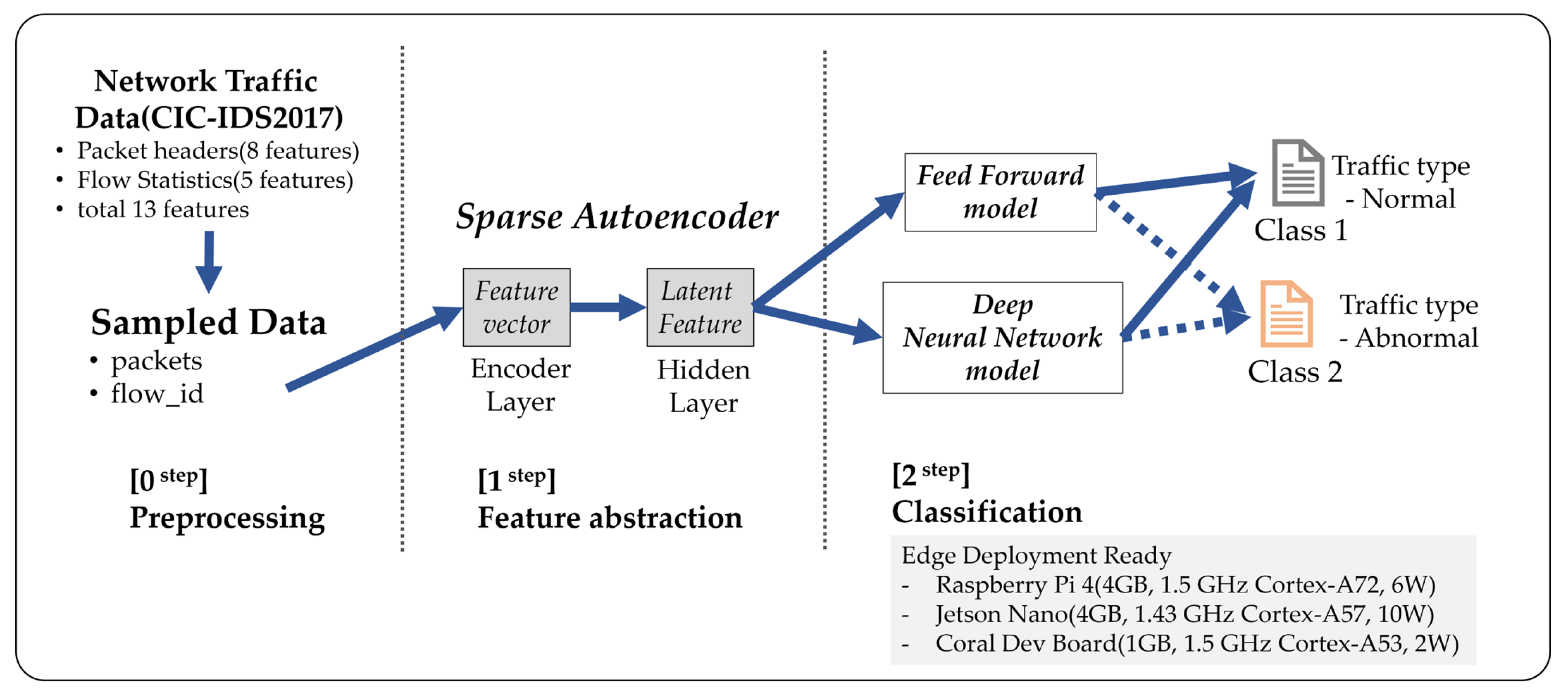 22], an unsupervised deep learning model, to compress and extract the core features from network traffic and flow data. The SAE model selectively activates input data to learn a sparse representation, thereby extracting the most significant feature vectors. We then conduct a comparative analysis of two lightweight classifier architectures—a FF model and a DNN model—which take the SAE-compressed vectors as input. These classifiers, despite their simple network structures, demonstrate high classification performance, making them well-suited for constrained environments like edge computing. Notably, this study moves beyond a simple accuracy comparison to provide a comprehensive evaluation of the models’ feasibility on edge devices by considering inference time, FLOPs, memory usage, and power consumption.