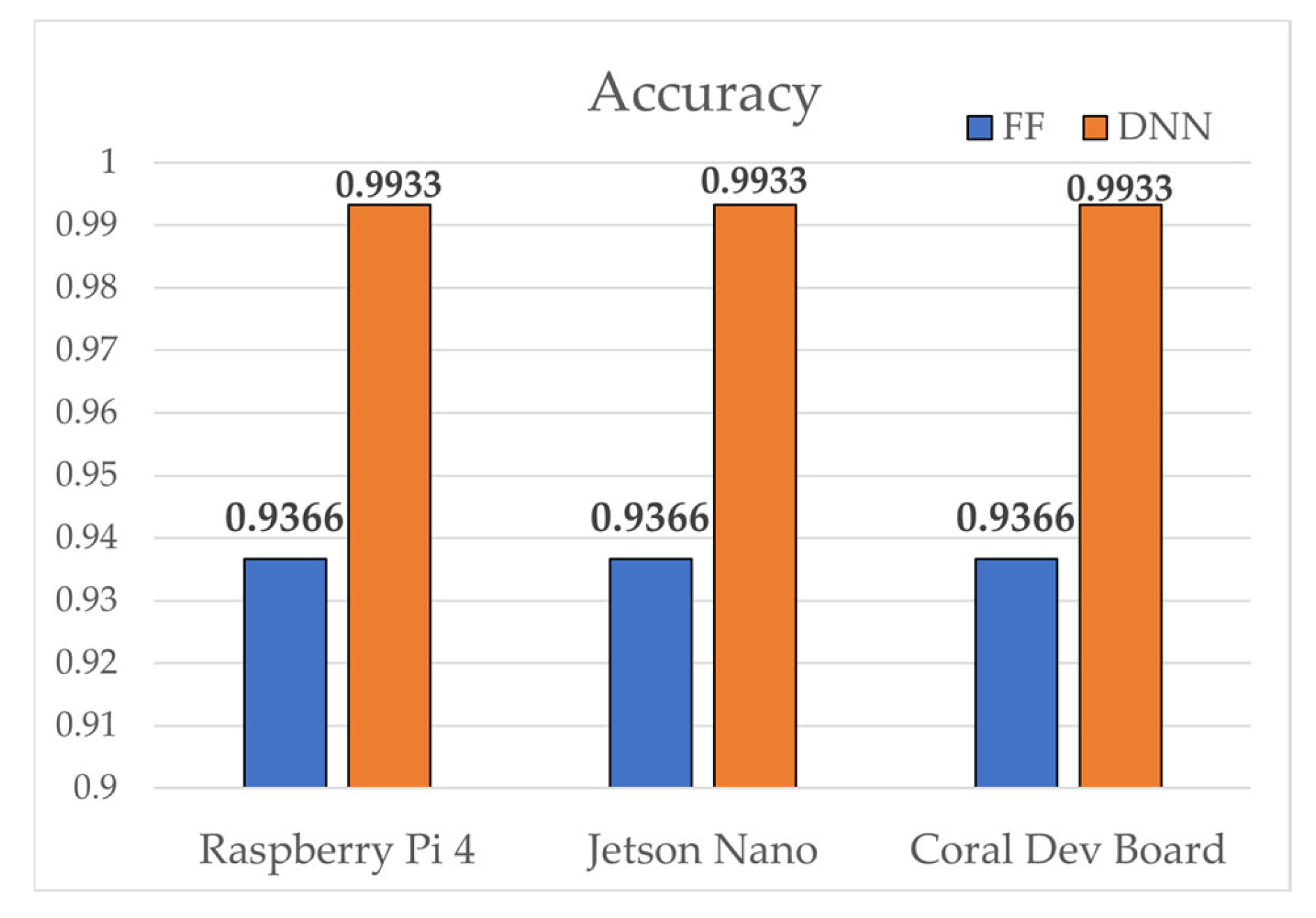 Figure 5 shows the inference latency results, with SAE-FF running significantly faster on a Raspberry Pi 4 with up to 19.7× lower latency, while SAE-DNN achieves near-real-time performance only on the Coral Dev Board due to edge TPU acceleration.